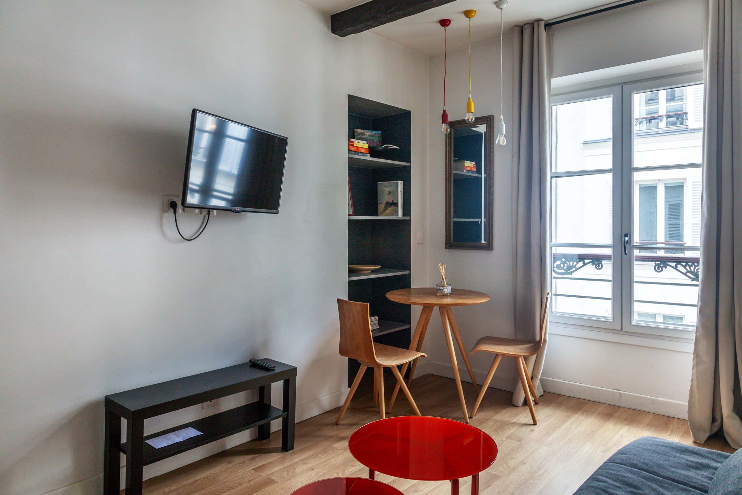 ## Space It is a really Parisian studio with a large living room, a separate full kitchen and a toilet/bathroom. We provide clean towels, sheets. It has free Wi-Fi and HD TV with international cable channels. The kitchen has all modern facilities with fridge, hob, microwave/grill and coffee maker. Shower and a separate room for the toilet. Body gel and shampoo will be at your disposal. There is a hair dryer and an iron with an ironing board. To store your clothes and personal effects, there is a spacious wardrobe. ## To access On the ground floor of a typical and quiet building in the heart of the Batignolles district, with 2 secure doors before having access to the apartment. ## Interactions Contact 7/7 on the platform, 5/7 by phone ## Neighborhood The chic Champs-Élysées district is defined by its wide avenue of the same name, which connects the majestic Arc de Triomphe to the busy Place de la Concorde roundabout. It also features high-end boutiques and slick offices, as well as fine restaurants and more casual take-out restaurants. The district also includes the elegant gardens of the Champs-Élysées and art museums such as the Grand Palais, which offers renowned exhibitions. ## Transit The apartment is located 2 minute walking distance from Franklin D. Roosevelt on line 1 and 9. From Roissy airport, you can take RER B until Les Halles, then line 1 until Franklin D. Roosevelt. From Orly Airport, you can take Orlyval until Antony, then RER B until Les Halles, then line 1 until Franklin D. Roosevelt. You can take a taxi, the prices are fixed. ## Notes A deposit will be requested but not cashed via our banking partner. A lease will be signed before arrival. Your passport number will be requested (requested by the Paris city hall) Non-smoking apartment. No noise after 10 p.m.
