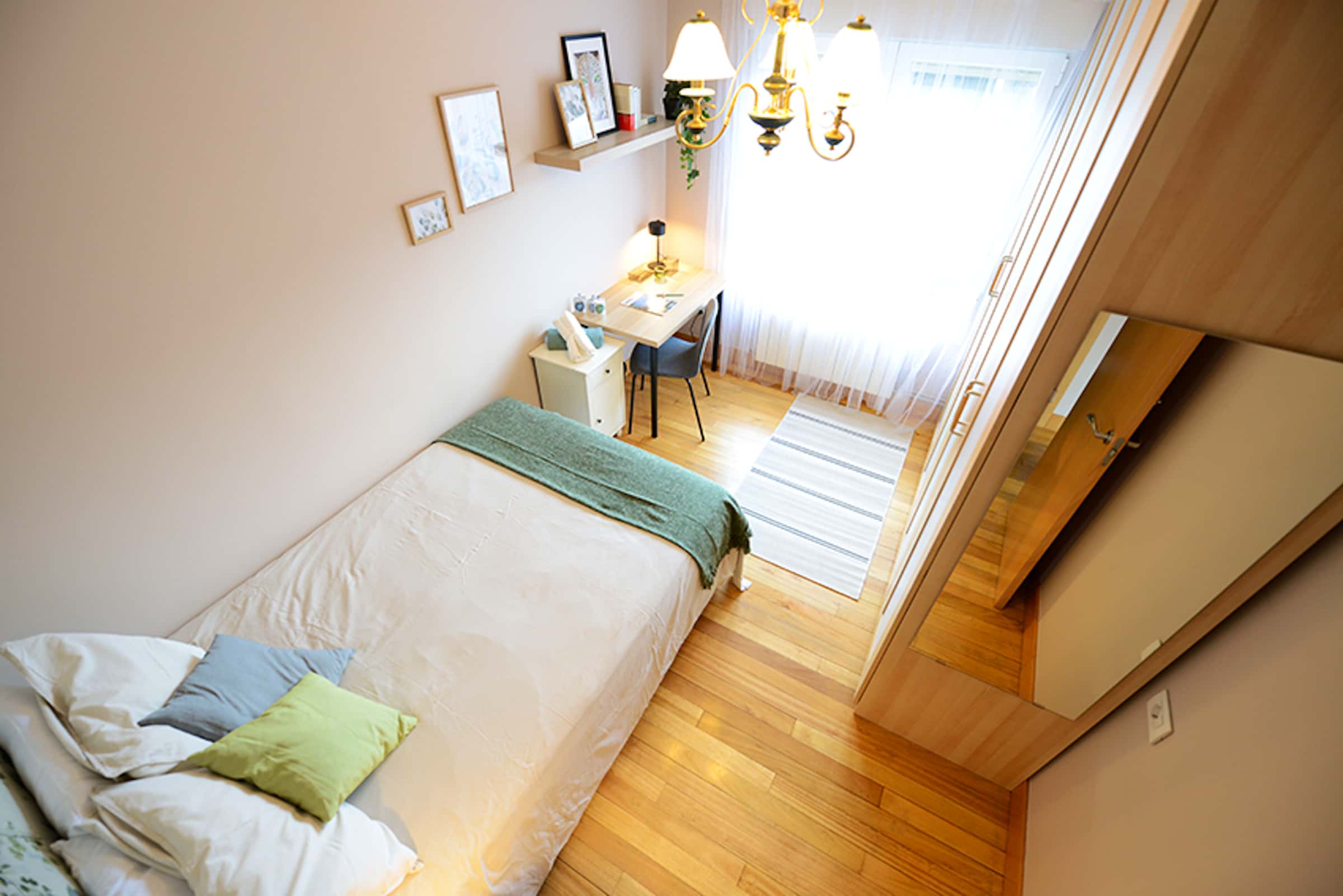 ZONA TXURDINAGA HABITACIÓN H3 PARA USO INDIVIDUAL. / DOBLE (El precio se incrementa 50€ más al mes) CON BAÑO PRIVADO. Habitaciones en piso reformado, con mobiliario nuevo a estrenar. Exterores y con mucha luz. Suelo madera y ventanas Climalit. Calefacción y agua caliente por caldera de gas individual. Zona de estudio con escritorio, silla, balda y flexo Equipadas con un amplio armario, cama doble de 1,35×1,90m y mesilla. Alfombra Ropa de cama: Protector de colchón, almohadas, plaid y cojines incluidos. Relleno nórdico, funda de relleno nórdico, toallas y sábanas no incluidas, se pueden comprar a la llegada. Alquilamos por meses naturales completos. Los gastos de suministros y limpieza de zonas comunes están incluidos en el precio. Por favor lee bien todos los detalles de los costes. CARACTERÍSTICAS – 80m2 | 3 habitaciones – H1: habitación de uso individual. – H2: habitación de uso individual o para pareja – H3: habitación de uso individual o para pareja con baño. – Reformado. ZONAS COMUNES – Cocina totalmente equipada (icluido lavavajillas) – Salón con gran sofá de cuero, TV, comedor y amplia terraza. – 2 baños completos. DESCRIPCIÓN DEL PISO Amplio, luminoso y muy cómodo. Un piso que te encantará por su cómodo y gran salón, por la moderna cocina muy bien equipada, por sus amplios armarios y sus prácticos baños. Reformado para estrenar, cuenta con 3 habitaciones (dos de ellas dobles), cocina, salón con comedor y terraza y dos baños completos. Suelo de madera y cerámica, ventanas de PVCy calefacción de gas. Es un cuarto piso con ascensor y todo exterior. Tiene una decoración con toques coloniales en marrones y verdes y con motivos tropicales que aportan un aire fresco y moderno. Está situado en Txurdínaga, un barrio residencial periférico muy bien comunicado que cuenta con amplias zonas verdes (Parque Europa) y deportivas (Polideportivo Municipal de Txurdinaga). No tiene zona de OTA, si tienes coche podrás aparcar sin preocuparte del horario. El metro más cercano queda a 5 minutos en Bolueta y se puede coger el Bus que te lleva a la Universidad de Leioa cruzando el Parque Europa en la parada de Santutxu A2321(Santutxu/UPV). Además hay varias líneas de autobuses BILBOBÚS que recorren todo Bilbao, en este enlace podrás verlas. Tienes varios supermercados en la misma calle y una panaderia-pastelería a la puerta de casa.
