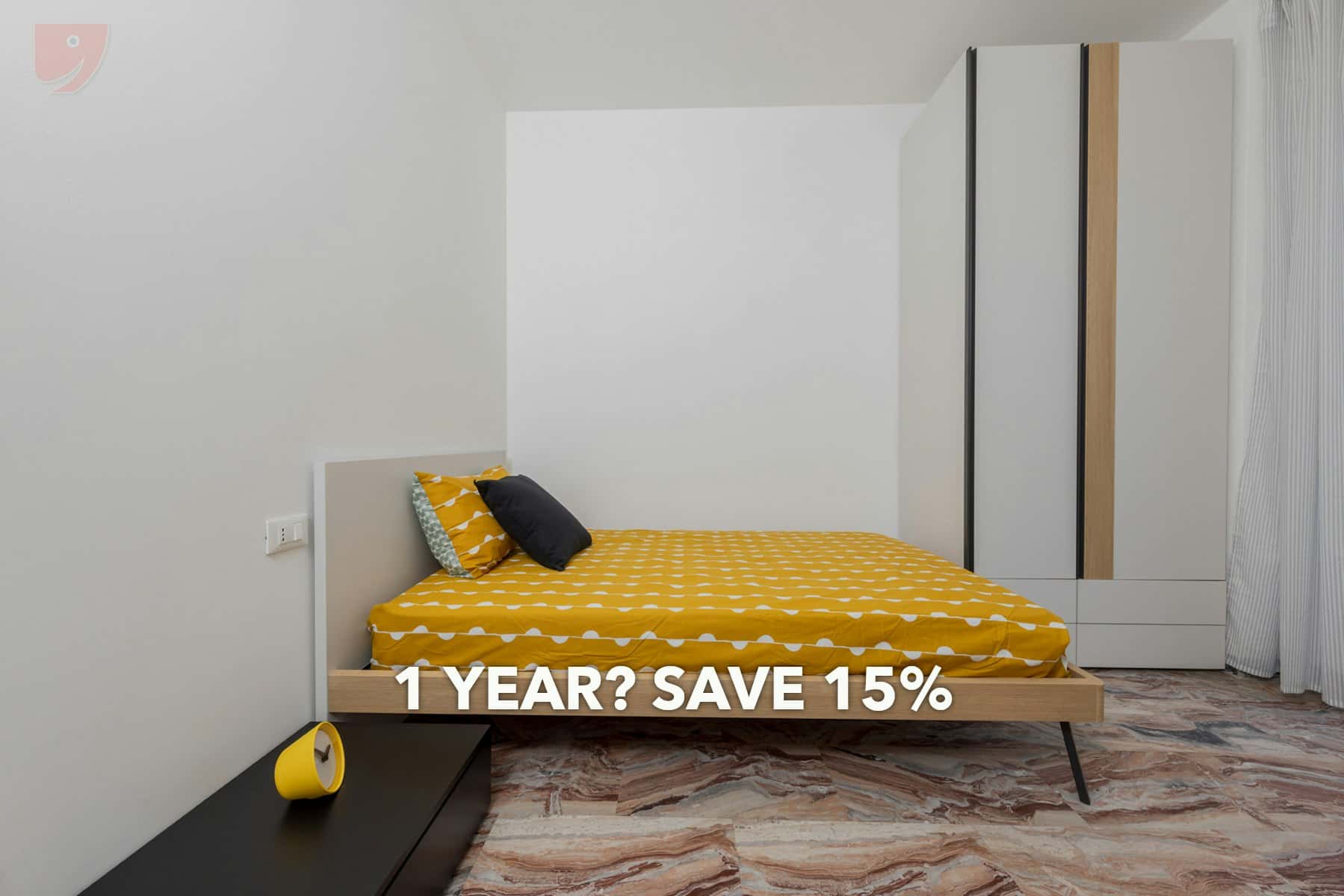 [ITA] Nella nostra azienda amiamo i soggiorni a lungo termine! Usufruite di sconti significativi se soggiornate con noi per 12 mesi. Se dovete soggiornare per meno di 12 mesi ma trovate qualcuno che vi sostituisca per il periodo rimanente, entrambi beneficerete dei nostri sconti sostanziali. Richiedete un preventivo oggi stesso e iniziate a risparmiare! Questa stanza è progettata per offrire comfort e funzionalità, creando un ambiente accogliente e ben organizzato. Il letto a una piazza e mezza, con rete a doghe e materasso ortopedico, garantisce un sonno ristoratore. Accanto al letto, un comodino con cassetto offre spazio per oggetti personali. L'armadio a due ante con cassettiera fornisce ampio spazio per vestiti, mentre la scrivania e la libreria creano un'area di lavoro ideale. La sedia ergonomica BABILA Pedrali aggiunge stile e comfort. Inoltre, il balcone offre un luogo piacevole per rilassarsi all'aria aperta. Questa camera rappresenta la scelta ideale per studenti alla ricerca di un ambiente tranquillo e studiato per le loro esigenze! Questo appartamento offre un ambiente accogliente e ben organizzato. Con 9 stanze e 3 bagni, è ideale per la condivisione tra studenti o giovani professionisti. La cucina abitabile è perfetta per preparare pasti insieme, mentre la zona living rappresenta uno spazio comune dove rilassarsi o socializzare. Sono presenti comfort moderni come lavatrice, asciugatrice, lavastoviglie e Wi-Fi, rendendo la vita quotidiana semplice e piacevole. Lo stile minimalista degli arredi assicura la massima funzionalità. [ENG] At our company, we love long-term stays! Enjoy significant discounts when you stay with us for 12 months. If you need to stay for less than 12 months but find someone to take over for the remaining period, both of you will benefit from our substantial discounts. Ask for a quote today and start saving! This room is designed to offer comfort and functionality, creating a welcoming and well-organized environment. The queen-size bed, with slatted base and orthopedic mattress, guarantees a restful sleep. Next to the bed, a bedside table with drawer offers space for personal items. The two-door wardrobe with chest of drawers provides ample space for clothes, while the desk and bookcase create an ideal work area. The BABILA Pedrali ergonomic chair adds style and comfort. Furthermore, the balcony offers a pleasant place to relax in the open air. This apartment offers a welcoming and well-organized environment. With 9 rooms and 3 bathrooms, it is ideal for sharing between students or young professionals. The eat-in kitchen is perfect for preparing meals together, while the living area represents a common space where you can relax or socialise. Modern conveniences such as a washing machine, dryer, dishwasher and Wi-Fi are present, making daily life simple and enjoyable. The minimalist style of the furnishings ensures functionality.