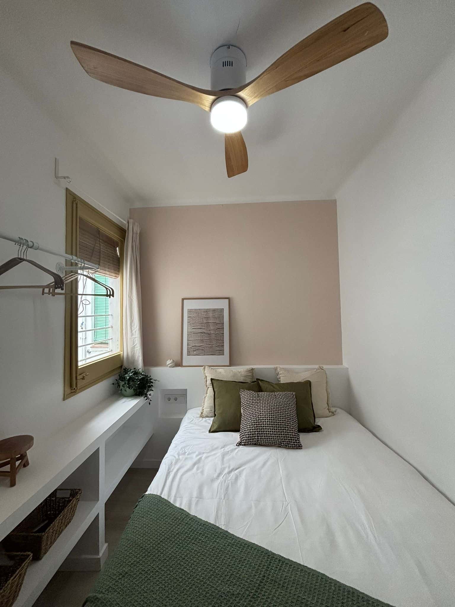 Please read the description before contacting. SUPER BRIGHT | NEWLY RENOVATED | ALL NEW FURNITURE – Located in Sant Martí. Includes all utilities (water, electricity, WIFI) and weekly cleaning with supplies. Furnished double room with lift-up bed, Smart TV, desk, closet, bedding, towels, laundry basket, and ceiling fan. Two shared bathrooms. Kitchen fully equipped with microwave, coffee machine, toaster, dishware, utensils, and cookware. Laundry area with washer-dryer. In Sant Martí near Sagrada Família and Passeig de Gràcia. Metro L one, L two, L five - five minutes away.