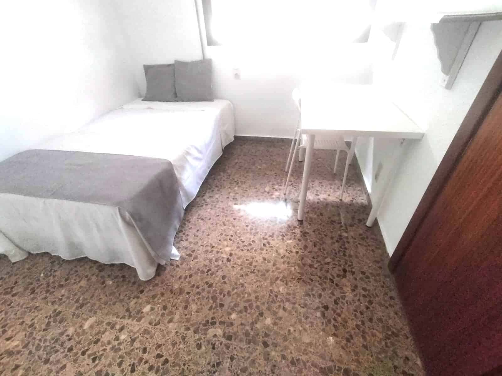 Habitación HabitaciónComprobar disponibilidad Descripción Habitación con cama individual, zona de estudio, armario empotrado, tendedero. Piso de 120m con cocina equipada, amplio salón-comedor, terraza. Situado en el emblemático edificio Iturbi. En su patio interior existen zonas deportivas como frontón, tenis y pista polideportiva de futbito y baloncesto, tres zonas ajardinadas y una piscina pequeña. También está la zona de la piscina grande, con su césped, solárium, botiquín y vestuarios, portero, dispone de un circuito cerrado de vigilancia por televisión mediante el cual controla los accesos al Edificio, local social, local para guardar bicicletas. La vivienda cuenta con instalación de Wifi, y cerraduras con llave en cada una de las habitaciones.