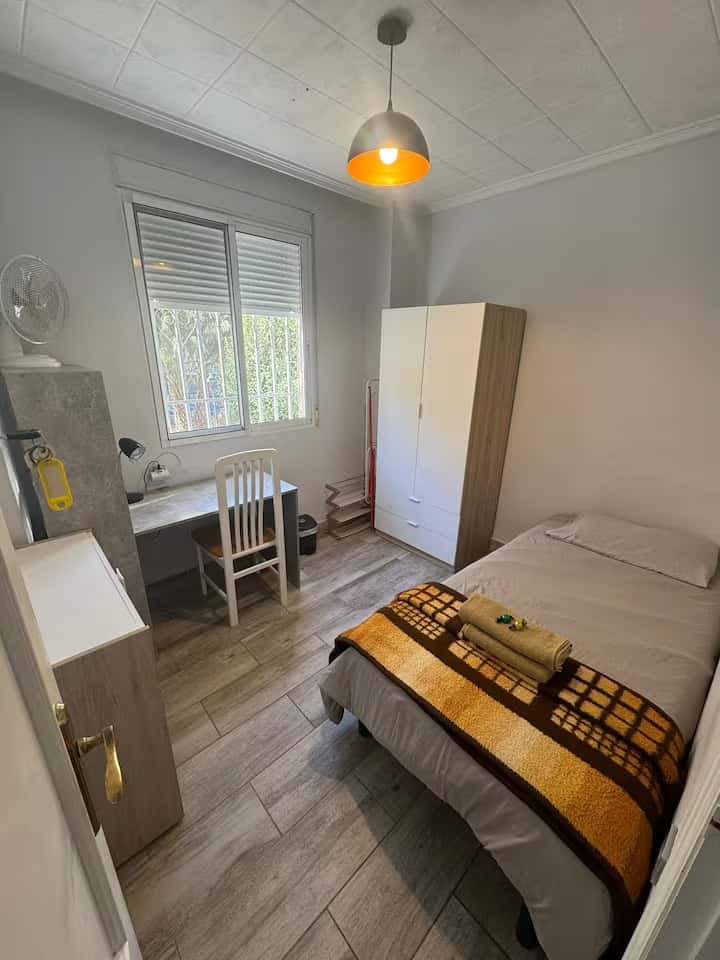 Acogedora habitación en el barrio de Ayora. Alquiler temporal de mínimo 11 días (Mid Term rent). ¡Queremos que te sientas como en casa! Por eso, en este cómodo espacio encontrarás un escritorio para trabajar, estudiar o leer y una cama individual de 90x200 cm. Por supuesto también tienes mesita de noche, armario y lugar para bolsos y toallas. Luz natural durante toda la tarde. ¡Te esperamos! El espacio Al lado de la Avenida de Blasco Ibañez, a 5 minutos a pie de la estación de metro y excelente comunicación con transporte público. Cerca de bares, restaurantes, supermercados y alquileres de bicicletas ValenBici. Servicios y zonas comunes Puedes disfrutar de las zonas comunes como el salón, el balcón y la cocina. Servicios y zonas comunes Podrás disfrutar en los espacios comunes de la casa, living comedor, balcón y cocina. Otros aspectos destacables Tendrás un espacio asignado tanto en la nevera como en el armario de la cocina para que guardes tu comida. Podrás disfrutar de los espacios compartidos con otros huéspedes. Datos del registro España - Número de registro nacional ESHFNT00004605400030950400100000000000000000000000007