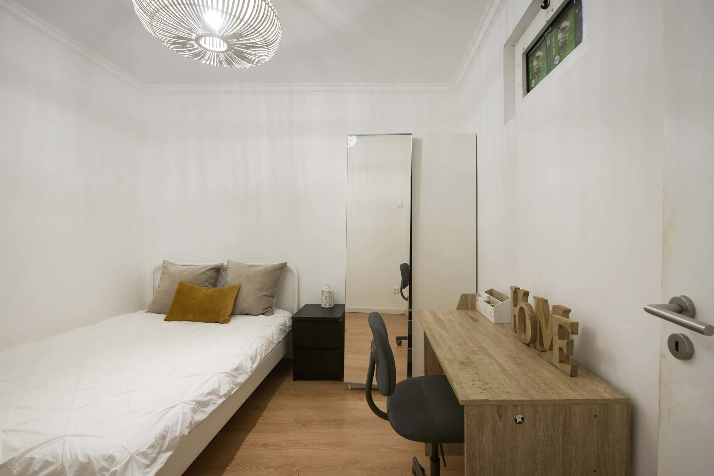 EN Situated on the fourth floor, this bright and cozy apartment in Alameda is the perfect place to live! Located in one of Lisbon’s most vibrant and well-connected areas, you’ll be surrounded by cafés, restaurants, supermarkets, and all essential services. The neighborhood offers excellent public transport connections, with the Alameda metro station and several bus stops just a few minutes away, giving you easy access to every part of the city. The apartment features a well-equipped kitchen, the shared areas are comfortable and welcoming, creating a pleasant environment for everyone. With 4 bedrooms and 1 bathroom, this apartment combines comfort, functionality, and an exceptional location, making it the ideal choice for students and young professionals looking to live conveniently in the heart of Lisbon. Alameda is one of Lisbon’s most vibrant and well-connected neighbourhoods, popular among students and young professionals. Centered around the beautiful Alameda Dom Afonso Henriques park, the area combines a relaxed atmosphere with urban convenience. You’ll find cafés, restaurants, supermarkets, and local shops on every corner, as well as excellent public transport links — including the Alameda metro station, which connects you quickly to the rest of the city. Metro: The Alameda metro station serves both the Green Line (Linha Verde) and the Red Line (Linha Vermelha) — giving you direct access to major points like the city center (Baixa/Chiado), the airport, and Parque das Nações. Buses: Several Carris bus lines stop around Alameda, including 708, 718, 720, 735, 742, 756, and 767, connecting you easily to areas like Cais do Sodré, Oriente, and Campo Grande. Trams: While Alameda itself doesn’t have a tram stop, you’re just a short walk from Avenida Almirante Reis, where classic Lisbon trams such as the 28E pass through — perfect for exploring the city’s historic neighborhoods. In short, whether you study, work, or just love to explore, Alameda makes it easy to get anywhere in Lisbon quickly. - Alameda Dom Afonso Henriques Park – The heart of the neighborhood, this large green space is perfect for relaxing, studying outdoors, or enjoying a picnic with friends. It features fountains, shady trees, and a lively atmosphere, especially on sunny days. - Instituto Superior Técnico (IST) – One of Portugal’s top universities, IST gives the area a vibrant student energy, with cafés, study spots, and affordable restaurants nearby. - Avenida Almirante Reis – A bustling avenue filled with local bakeries, international eateries, and vintage shops — ideal for grabbing a pastel de nata or exploring Lisbon’s diverse food scene. - Igreja de São João de Deus – A beautiful modernist church located right next to Alameda Park, known for its striking architecture. - Fonte Luminosa & Surroundings – The “Luminous Fountain” at the top of Alameda Park is a local landmark, especially stunning when illuminated at night, and often surrounded by small local markets and events. - No smoking.- No pets allowed.- No parties.- Trash must be taken out daily.- Short-term visitors are allowed (2 days). Longer period: €20 per day.- Utilities: included up to €25 per tenant.- Cleaning: offered by the landlord.- Bedding: pillows, duvet, and bed sheets are not provided.- Payment before check-in: first and last month, deposit and admin fee.- Check-ins: from Monday to Saturday from 4pm until 7:30pm. No check-ins on Sundays and bank holidays. Check-in is authorized only 24h after the payment is confirmed in our bank account and the contract is signed The bedroom is a cozy and comfortable space, designed to offer residents a peaceful and restful environment. The room features a cozy double bed, a desk, a chair, and storage space for your belongings.