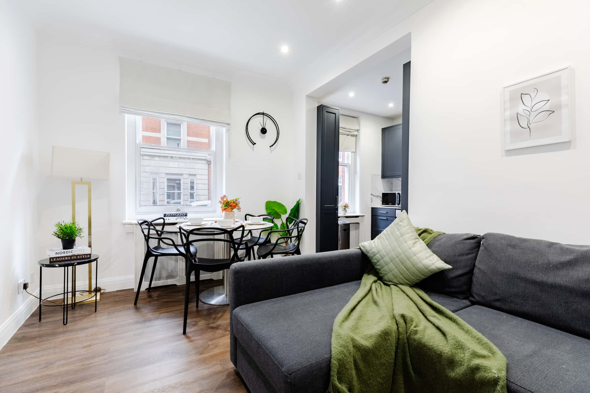 A modern and well-presented one bedroom flat on the Raised Ground Floor of a professionally managed building conveniently located just moments away from Oxford Circus, Regent Street and Tottenham Court Road. The flat comprises a large and airy reception room, open-plan fully fitted kitchen complete with breakfast bar, dishwasher & washer dryer, two double bedrooms, fitted bathroom and additional separate WC. The apartment has a total area of 43.5 square meters. There are 2 bedroom(s), 1 bathroom(s). . It also has 1 living room(s). No additional fee is requested for the condominium. A minimum stay of 1 month(s) is required. It is possible to book directly online.