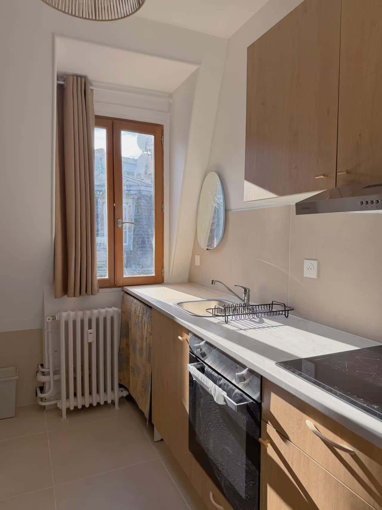 The apartment is located on the top floor of a charming French-style building and offers a functional layout similar to student-style shared living. It comprises three rooms in total: a shared kitchen and bathroom, and two separate bedrooms, each with its own independent entrance door, ensuring privacy for each occupant. The monthly total cost is €1,500, consisting of €1,000 in rent and a €500 property management fee, which includes water and central heating. Electricity and internet are to be paid separately by the tenant.