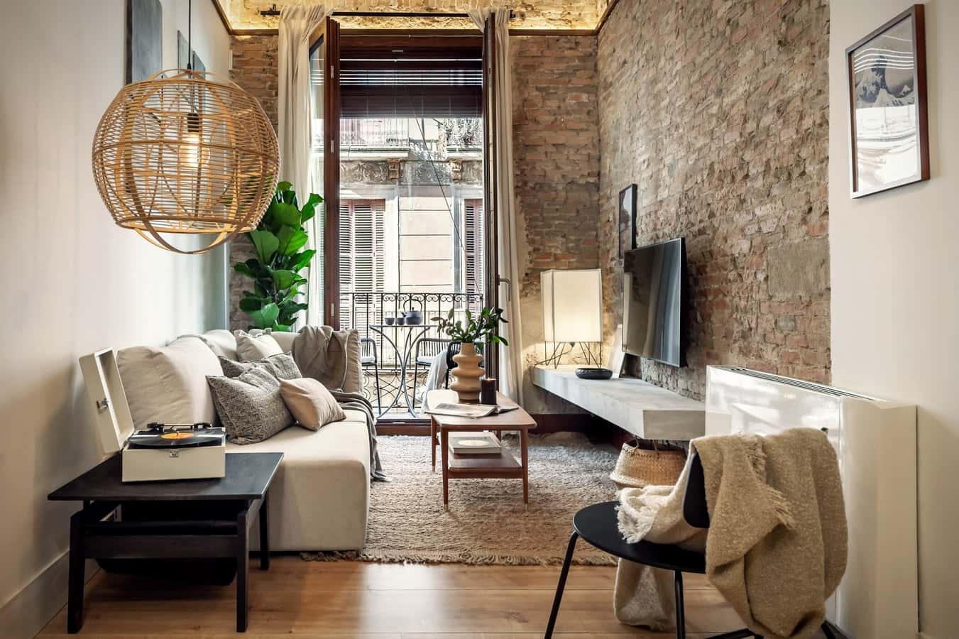 Located in one of Barcelona's most iconic neighborhoods, Kasa combines a clean and bright design with timeless Catalan architecture. Upon walking into the 62 square meter space, there is an open plan living room, fitted with a plush couch, leading to a balcony. Notice the brick wall upon which the Smart TV is mounted and the wood beams across the ceiling. The balcony has a small table with two chairs. Next to the entrance, there is a dedicated work from home area, characterized by a bold bright color. The kitchen, with geometric floor tiles, is fully furnished with all cooking utensils and appliances. Adjacent to the kitchen, there is a dining area equipped with table and wooden shelves to store tableware. Past the glass door, there is a bathroom on the right with shower. Both rooms have queen-sized beds and wooden closets with full mirrors. All bed and bath linens are provided. *We welcome pets, fees are subject to apply. Guests will be informed of any additional charges in the final contract. *We cannot be held liable for any noises (construction, or street noise) done outside the apartment. We also cannot be liable for any rooms without air conditioning (all the rooms with air conditioner will be explicitly explained in our description). We will not accept any reservation cancellations or refund request related to these two issues. *Our in-house design team expertly selects all apartment furniture and decor to ensure the highest level of quality and comfort. As part of consistent home upkeep, design improvements, and photo staging, there may be minor differences in furnishings seen in the photos and what you find in the apartment. Inquire with a sales agent for any questions or doubts. *This accommodation may only be used for stays longer than 31 nights for personal purposes such as holiday, recreational, or leisure. The information provided may be submitted to the relevant registry and/or administrative authority in accordance with Catalan regulations.