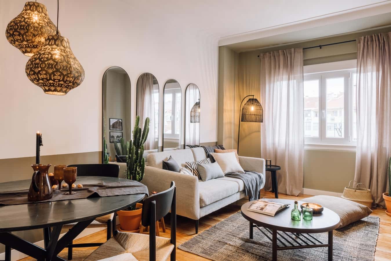 Intentionally detailed with artful design, Tazarine offers a 66 square meter oasis in the heart of the Santo Antonio district. Take a stroll down Avenida da Liberdade to indulge in local flavors and branded shops or step inside Tazarine’s stunning two-bedroom, one bath interiors to discover a Saharan escape with a Lisbon backdrop. Past the entrance, Tazarine is quick to flash its entertaining flare with ample seating for guests and visitors. The living and dining area is to the immediate left with natural light bathing the space. Traditional, arch-shaped mirroring frames the hand-selected furnishings of the living room. The four-person dining set encourages desert-infused hospitality with the layered tapestries creating an accent wall. Across from the dining area is a dedicated workstation. At the far end of the living area, the hallway leads to a cuisine detour on the right. Caramel cabinetry blends with the modern appliances in the kitchen. All the necessary cooking utensils are included to create a delectable meal. Across the kitchen is Tazarine’s first bedroom. An elegant, queen-sized bed lies in the center of the space covered with organic textiles and stone blues. A large window sits to the left of the room while the right offers built-in storage. The next door on the left is the second bedroom. The attention is on the accent wall behind the queen-sized bed, showing a mix of organic, Saharan-inspired shapes. At the end of the hall is the bathroom. White marble covers every wall. The corner of the space offers an all-glass shower. All bedding and linens are provided. *We welcome pets, fees are subject to apply. Guests will be informed of any additional charges in the final contract. *We cannot be held liable for any noises (construction, or street noise) done outside the apartment. We also cannot be liable for any rooms without air conditioning (all the rooms with air conditioner will be explicitly explained in our description). We will not accept any reservation cancellations or refund request related to these two issues. *Our in-house design team expertly selects all apartment furniture and decor to ensure the highest level of quality and comfort. As part of consistent home upkeep, design improvements, and photo staging, there may be minor differences in furnishings seen in the photos and what you find in the apartment. Inquire with a sales agent for any questions or doubts.