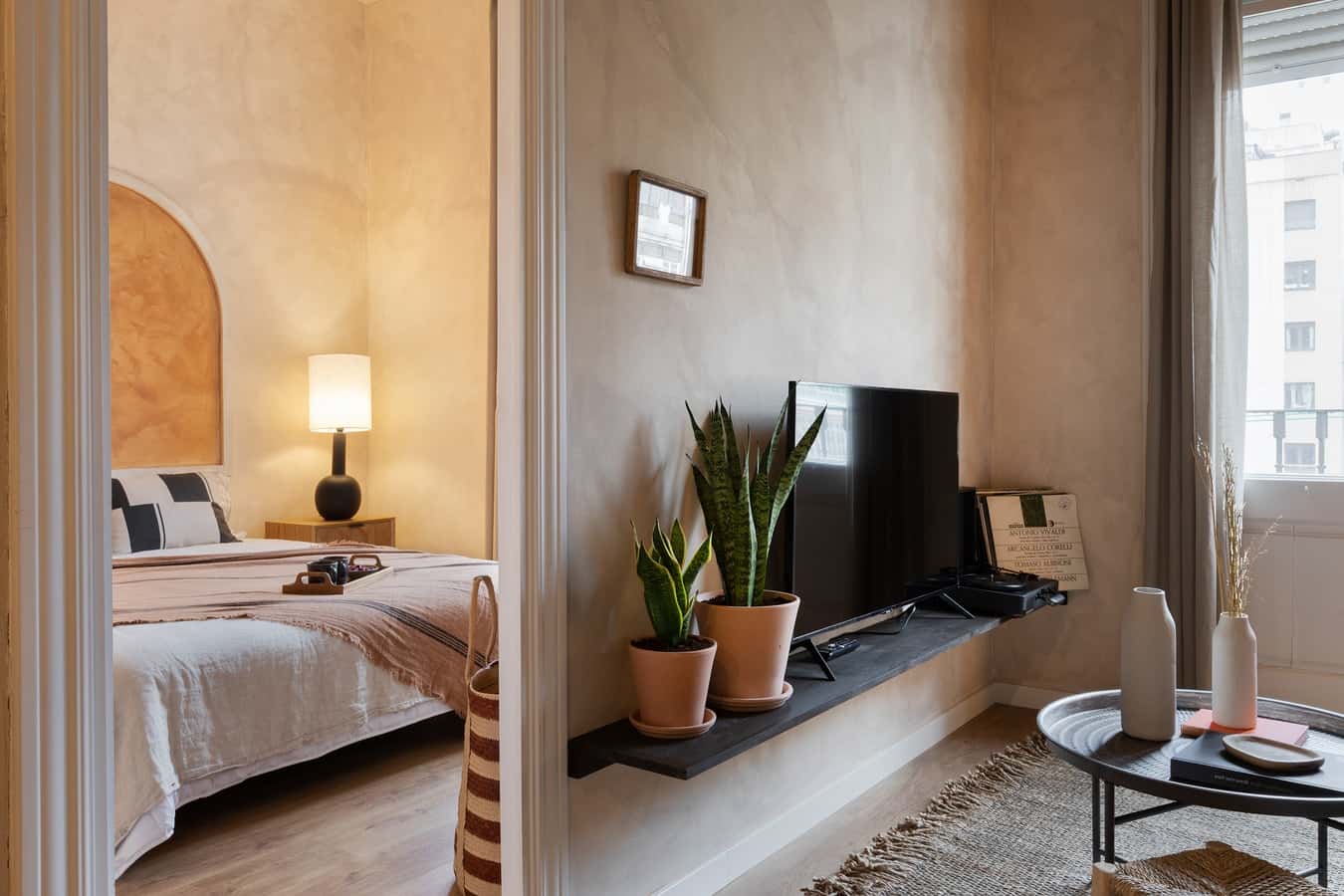 A Saharan escape perfectly blended with Spanish style: Amourah is a masterpiece. This 73 square meter apartment inspires awe inside and outside of the home. Resting in the Esquerra de l'Eixample neighborhood, guests will find a perfect mix of classic Spanish restaurants with international, fusion flavors. Once inside, this two-bedroom, two-bathroom home feels divinely desert-like throughout all its interiors and two, sun-soaked balconies. Earth tones cloak the spacious entryway as guests are guided down the hall toward the right. The first door on the left leads to a bedroom. A nook with natural fiber-coated walls houses a cozy daybed. The room includes ample storage space. Further down the hall, the next door to the right offers up Amourah’s office. This spacious workstation provides a private and ergonomic option for productivity. Across the hall is the detached bathroom. A classic Catalan tiling covers the floor while sleek subway tiles cover the walls and into the shower-tub combination. At the end of the hallway, the space lends itself to an open, dining and kitchen area. To the left, sits a fiber-thatched, four-person dining set. The right of the room is themed with a contemporary and classic mix. The modern, white cabinetry complements the modern appliances while a gaze up at the ceiling revealed the exposed brick, barrel-style ceilings. The kitchen comes fully equipped with all the necessary cooking utensils. Continue further into the space to find the living area past the kitchen. Saharan-style geometric art hangs over the hand-selected furnishings. The french doors at the far end of the living room open up to a luminous balcony. The door to the left of the living room leads to the ensuite bedroom. A terracotta-hued arch sits behind the queen-sized bed. To the right of the room is Amourah’s second balcony. At the other end is the ensuite bathroom. A sense of serenity washes over with the ivory-toned palette, double vanity, hanging plants, and all-glass, walk-in shower. For comfort, this apartment comes equipped with air conditioning in the Living Room and in one Bedroom. All bedding and linens are provided. *We welcome pets, fees are subject to apply. Guests will be informed of any additional charges in the final contract. *We cannot be held liable for any noises (construction, or street noise) done outside the apartment. We also cannot be liable for any rooms without air conditioning (all the rooms with air conditioner will be explicitly explained in our description). We will not accept any reservation cancellations or refund request related to these two issues. *Our in-house design team expertly selects all apartment furniture and decor to ensure the highest level of quality and comfort. As part of consistent home upkeep, design improvements, and photo staging, there may be minor differences in furnishings seen in the photos and what you find in the apartment. Inquire with a sales agent for any questions or doubts. *This accommodation may only be used for stays longer than 31 nights for personal purposes such as holiday, recreational, or leisure. The information provided may be submitted to the relevant registry and/or administrative authority in accordance with Catalan regulations.