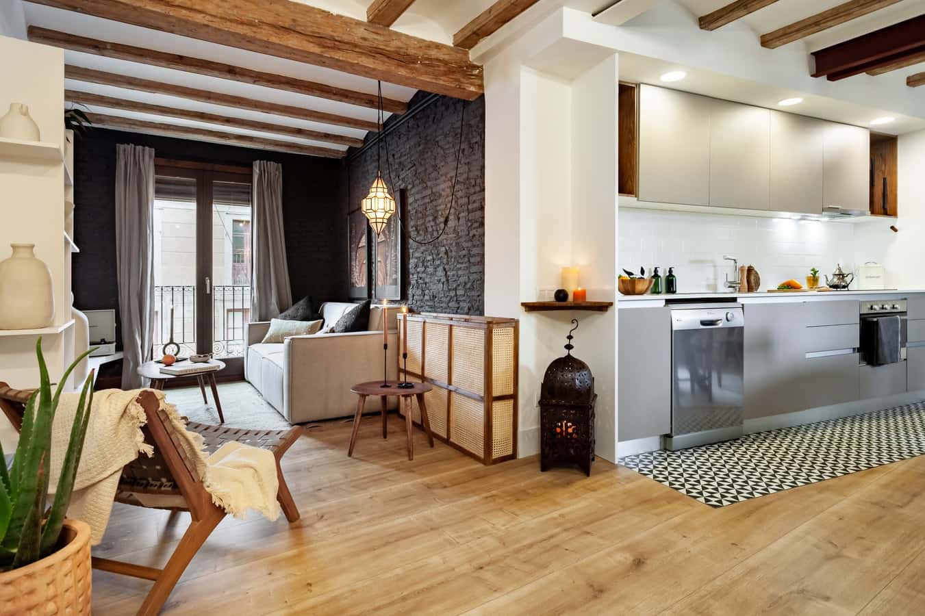 Offering Saharan inspiration and Catalan classics, this 70 square meters home is nothing but pure bliss. Reveling in the surroundings, Anfa is located in the trendy Santa Pere, Santa Caterina i La Ribera neighborhood. Indulge in the fresh offerings at the Santa Caterina farmer’s market or gaze up at the Gaudi-inspired architecture throughout the area. The awe ensues back inside this two-bedroom, two-bathroom beauty. Upon entrance, guests will find the living room straight on. Modern meets classic with a charcoal-wash exposed brick behind the sofa, an all-white ceramics collection, and the original wooden beams up above. To the right of the entrance, is a modern, dedicated workstation. Next to that is the kitchen and dining area combination. A classic Barcelona tile partitions the kitchen space. The kitchen is complete with modern appliances and all the necessary cooking utensils. The dining set is fit for four. Down the hallway, the first right leads to Anfa’s detached bathroom. Saharan aesthetics carry throughout the entire space and into the walk-in shower. At the end of the hallway, the next door on the right leads to a double bedroom. An all-wood Arabian arch sits behind the queen-sized bed. The right side of the room is lined with ample storage space. The room to the left is nothing short of comfort. Behind the door sits a floor-to-ceiling wardrobe. A day bed sits to the side of the room offering a perfect space to read, rest, and relax. All bedding and linens are provided. *We welcome pets, fees are subject to apply. Guests will be informed of any additional charges in the final contract. *We cannot be held liable for any noises (construction, or street noise) done outside the apartment. We also cannot be liable for any rooms without air conditioning (all the rooms with air conditioner will be explicitly explained in our description). We will not accept any reservation cancellations or refund request related to these two issues. *Our in-house design team expertly selects all apartment furniture and decor to ensure the highest level of quality and comfort. As part of consistent home upkeep, design improvements, and photo staging, there may be minor differences in furnishings seen in the photos and what you find in the apartment. Inquire with a sales agent for any questions or doubts. *This accommodation may only be used for stays longer than 31 nights for personal purposes such as holiday, recreational, or leisure. The information provided may be submitted to the relevant registry and/or administrative authority in accordance with Catalan regulations.