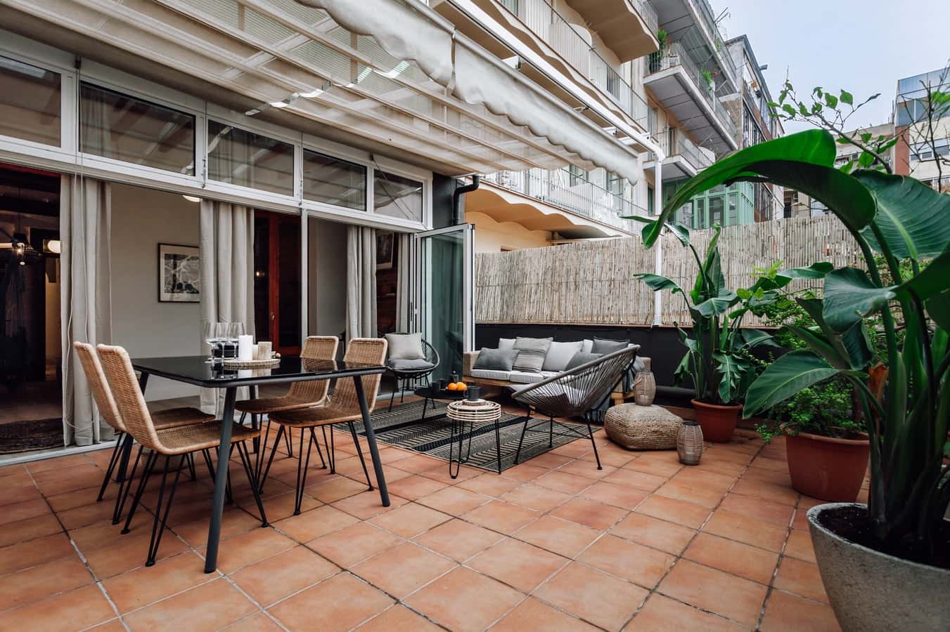 Inspired by the different colors and textures found in the jungle, Lodja is a 100 square meters property of 1 bedroom and 1 bathroom. Located in the L’Esquerra de l’Eixample district, guests are invited to try the local flavors or admire the modernist architecture. Exposed brick wall contrasts the beautiful hand painted opposing wall in the living room. Step past the jungle greenery in the corner of the salon to find a dedicated custom-made office space as well as a hammock. Lodja’s expansive terrace is fitted with a chill out area and outdoor dining area. The fully furnished kitchen is sleek and stylish with modern finishings. Lodja offers comfort and style within its 1 queen-sized bed bedroom and bathroom. Fully furnished, this home comes with everything you need, including bedding and linens. *We welcome pets, fees are subject to apply. Guests will be informed of any additional charges in the final contract. *We cannot be held liable for any noises (construction, or street noise) done outside the apartment. We also cannot be liable for any rooms without air conditioning (all the rooms with air conditioner will be explicitly explained in our description). We will not accept any reservation cancellations or refund request related to these two issues. *Our in-house design team expertly selects all apartment furniture and decor to ensure the highest level of quality and comfort. As part of consistent home upkeep, design improvements, and photo staging, there may be minor differences in furnishings seen in the photos and what you find in the apartment. Inquire with a sales agent for any questions or doubts. *This accommodation may only be used for stays longer than 31 nights for personal purposes such as holiday, recreational, or leisure. The information provided may be submitted to the relevant registry and/or administrative authority in accordance with Catalan regulations.
