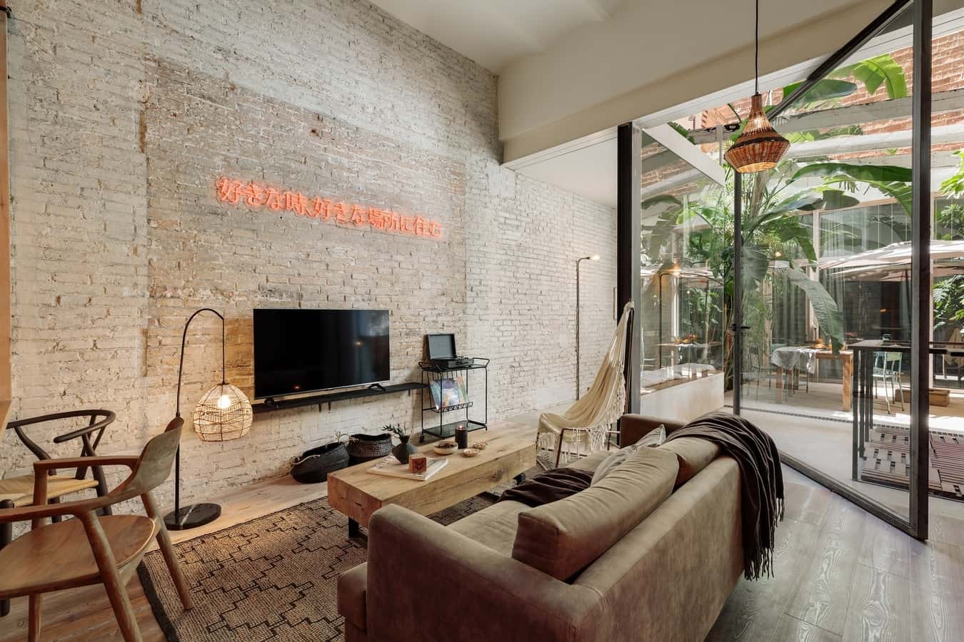 EN Our mission is to empower individuals to immerse themselves in new places by having a home wherever they go. We do this by providing artfully designed fully furnished and serviced apartments for stays of one month or more. We are currently present in some of the most important cities in Europe. Walk into this hidden paradise right in the middle of Gràcia. This spacious 114 square meter duplex boasts a private outdoor patio filled with banana trees and exotic plants, creating a tropical atmosphere. Upon entering, find yourself in an open plan kitchen with ample closet space, with hand-crafted new wooden doors. The kitchen comes fully equipped with all the essentials and electro domestic appliances. Across, there is a wooden dining table. In the living room, there is a custom-built wooden coffee table and hand-designed hammock-like chair, both commissioned from a local artisan. Across from the leather sofa, there is more closet space as well as a clandestine bathroom. Newly painted, the bathroom features a washer and dryer hidden behind a curtain. The floor to ceiling glass door leads to the outdoor patio which is fitted with a dining area. The hallway has a bench with two versatile puffs. On the other side of the patio, there is a walk-in closet and full bathroom with custom made sliding wardrobe doors and a vanity area. Walk up the built-in ladder to the second bedroom with a full length mirror. The bedroom is fitted with a custom made wooden bed frame, inspired by Japanese tatamis. The master bedroom has high ceilings and a unique straw hanging piece above the bed. The room has many closets with new wooden handles and comes with an ensuite bathroom. Up on the second floor, there is a dedicated work area, which looks out onto the patio. The space is adorned with greenery throughout. As an added extra, there is a Cinema room with a pull-down screen and projector, with a comfortable bed to watch from. The space also comes with large bookshelves to double as a library. For comfort, this apartment comes equipped with air conditioning in the Living Room and in two bedrooms. *We welcome pets, fees are subject to apply. Guests will be informed of any additional charges in the final contract. *We cannot be held liable for any noises (construction, or street noise) done outside the apartment. We also cannot be liable for any rooms without air conditioning (all the rooms with air conditioner will be explicitly explained in our description). We will not accept any reservation cancellations or refund request related to these two issues. *Our in-house design team expertly selects all apartment furniture and decor to ensure the highest level of quality and comfort. As part of consistent home upkeep, design improvements, and photo staging, there may be minor differences in furnishings seen in the photos and what you find in the apartment. Inquire with a sales agent for any questions or doubts. *This accommodation may only be used for stays longer than 31 nights for personal purposes such as holiday, recreational, or leisure. The information provided may be submitted to the relevant registry and/or administrative authority in accordance with Catalan regulations. NRA ESFCNT00000806600019258100000000000000000000000000005