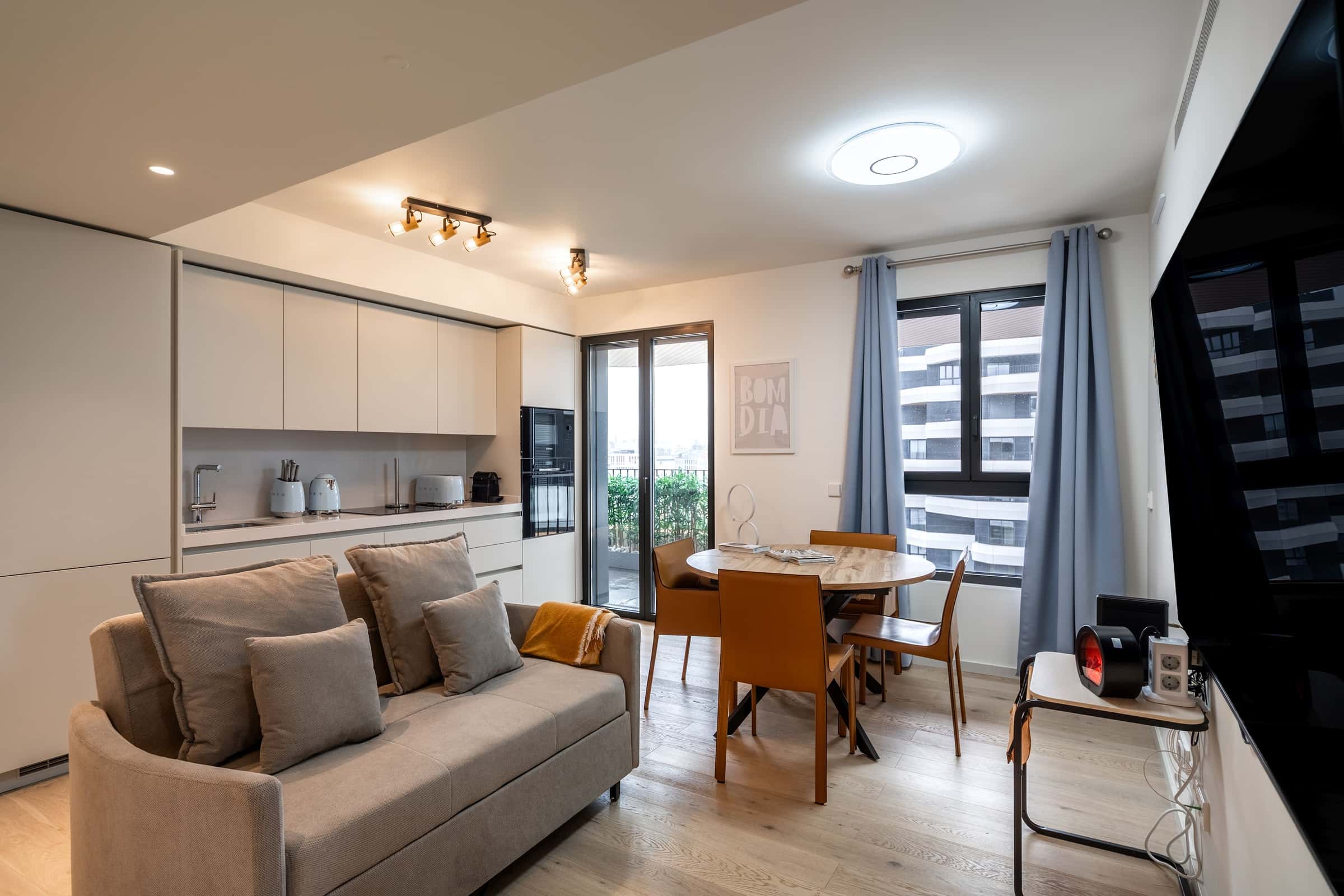 This elegant one bedroom apartment is located in the prestigious Parque das Nações area, set within a newly built condominium with contemporary architecture and excellent amenities. The apartment stands out for its generous areas and abundant natural light. The social area features a fully equipped kitchen, including a washing machine and dishwasher, seamlessly integrated in an open plan layout with the living and dining area, creating a modern and functional space ideal for mid term stays. The bedroom is comfortable and benefits from large built in wardrobes, offering excellent storage capacity. Throughout the apartment there are several additional built in cabinets, ensuring practicality and organization. The bathroom presents a contemporary design with high quality finishes. The property also includes one parking space in the building’s garage and access to the condominium swimming pool, providing extra comfort and convenience. Located in one of Lisbon’s most sought after neighborhoods, with easy access to shops, services, public transport and green areas, this apartment is an excellent choice for those seeking comfort, quality and a prime location for a temporary stay. Cleaning & Linen Services: - A mandatory final cleaning fee of 160€ will be applied to all bookings. - You have the option to choose a monthly cleaning service, which includes linens, for an extra 80€ per month. - If you prefer to skip the monthly cleaning, a member of our team will need to conduct a bimonthly inspection of the property. Please note that linens are not included with this option. - Linens can be added for an additional monthly fee. Additional Costs: - Utilities: Not included; estimated at 140€ per month, additional charges may apply for overages - Note: Administrative fee not included. 10% of the rent - Deposit: 1 month