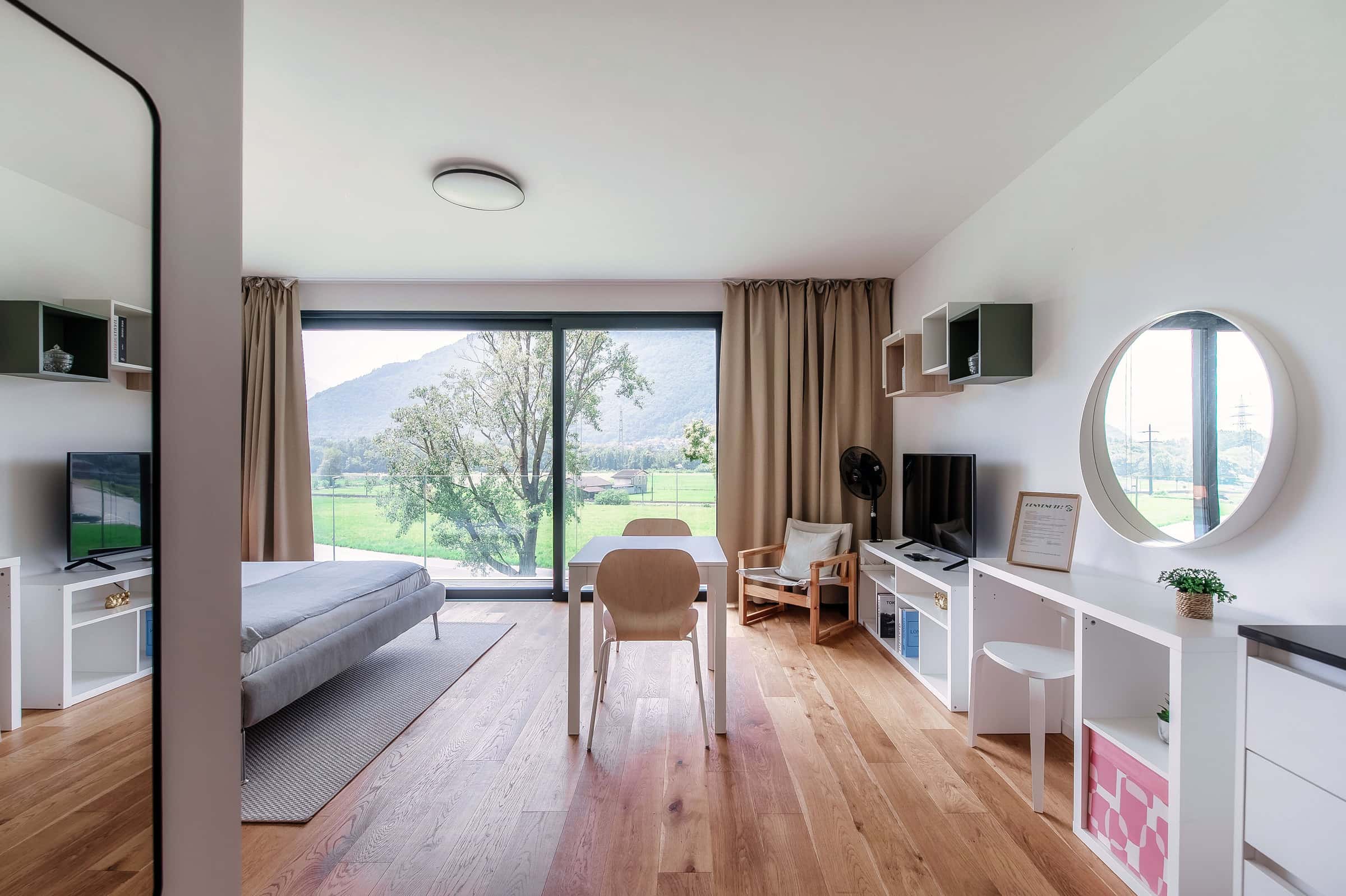 Il moderno e accogliente bilocale ANDROMEDA, situato al secondo piano della Residenza Ticino a Claro, gode di una posizione strategica per chi desidera esplorare la natura ticinese e i suoi luoghi di interesse più iconici. A soli 10 minuti di auto da Bellinzona, famosa per i suoi castelli patrimonio dell’UNESCO, e a breve distanza dai laghi di Lugano e Maggiore, ANDROMEDA rappresenta il punto di partenza ideale per avventure tra le montagne e relax. Lo spazio, luminoso e ben organizzato, garantisce un soggiorno pratico e confortevole. La cucina a vista, completamente attrezzata con elettrodomestici moderni e utensili da cucina, è pensata per soddisfare ogni esigenza. Il tavolo da pranzo, posizionato accanto alle ampie porte finestre, regala una vista incantevole sul giardino e sulle montagne. L’ambiente include un letto matrimoniale, una comoda poltrona in legno, una scrivania e una smart TV. Il bagno, caratterizzato da un design minimalista, è dotato di una spaziosa doccia walk-in e accessori moderni. Inoltre, tutti gli ospiti della Residenza Ticino possono accedere alla meravigliosa terrazza condivisa, dove godere della bellezza del panorama. L’appartamento dispone di un parcheggio privato gratuito adiacente alla struttura. Viene fornita biancheria da letto di qualità, asciugamani e kit di cortesia. Lasciamo anche un cestino regalo con il necessario per la vostra prima colazione. È vietato fumare. È vietata ogni attività commerciale all’interno dell’appartamento. Accesso: Ti ricordiamo che entrerai nell'appartamento effettuando un SELF CHECK-IN. Dopo aver completato con successo la registrazione online, ti verrà inviata una e-mail con le ISTRUZIONI (inclusa una guida passo passo) su come accedere autonomamente all'appartamento. In caso di necessità, il nostro servizio clienti è pronto ad assisterti dalle 8:00 alle 22:00 tramite telefono, email o Whats-app. Nei dintorni: La posizione strategica della Residenza Ticino a Claro consente di scoprire alcune delle meraviglie più suggestive del Canton Ticino. A circa 15 minuti, raggiungibile in auto, tramite la teleferica o attraverso un incantevole sentiero panoramico, si trova il Monastero di Santa Maria Assunta, un prezioso luogo di interesse storico e artistico immerso nella quiete della natura. Gli appassionati di escursionismo possono esplorare le numerose reti di sentieri che attraversano le valli Calanca e Blenio, regalando panorami mozzafiato e un’immersione completa nell’ambiente alpino. Dalla Funivia Pizzo di Claro a Lumino, è possibile raggiungere i Monti di Saurù, punto di partenza per numerose avventure outdoor e la capanna Brogoldone. A soli 10 minuti di auto si trova Bellinzona, il capoluogo del cantone, rinomato per i suoi tre castelli medievali – Castelgrande, Montebello e Sasso Corbaro – dichiarati patrimonio dell’umanità dall’UNESCO. Qui è possibile passeggiare lungo le stradine del centro storico, visitare le boutique locali, gustare la cucina tradizionale nei numerosi ristoranti o immergersi nella vivace atmosfera del mercato del sabato. Inoltre, i laghi di Lugano e Maggiore, raggiungibili in circa mezz’ora, offrono scorci pittoreschi, attività acquatiche e una vasta scelta di caffè e ristoranti sul lungolago. Come arrivare: In auto: dall’autostrada A2, prendere l’uscita verso “Bellinzona” e proseguire sulla sinistra in direzione di “Claro”. Impostando il GPS, in circa 10 minuti si raggiungerà la struttura. In treno: dalla stazione di Castione, prendere l’autobus N. 8 e scendere alla fermata “Claro, Cassero”. La struttura dista circa 10 minuti a piedi. The modern and cozy one-bedroom apartment ANDROMEDA, located on the second floor of Residenza Ticino in Claro, enjoys a strategic position for those wishing to explore Ticino's nature and its most iconic attractions. Just a 10-minute drive from Bellinzona, famous for its UNESCO World Heritage castles, and a short distance from the lakes of Lugano and Maggiore, ANDROMEDA is the perfect starting point for mountain adventures and relaxation. The space, bright and well-organized, ensures a practical and comfortable stay. The open-plan kitchen, fully equipped with modern appliances and kitchen utensils, is designed to meet all your needs. The dining table, placed next to the large French windows, offers a delightful view of the garden and mountains. The environment includes a comfortable double bed, a cozy wooden armchair, a desk, and a smart TV. The bathroom, designed with a minimalist aesthetic, includes a spacious walk-in shower and modern fixtures. Additionally, all guests of Residenza Ticino can access the wonderful shared terrace, where they can enjoy the beauty of the panorama. The apartment also offers a private parking space adjacent to the property. Quality bedding, towels and a courtesy kit are provided. We also leave a gift basket with some necessary items for your first breakfast. Any commercial business is forbidden inside the apartment. Guests have the access of the whole apartment. Access: Please be reminded that you will enter the apartment by doing a SELF CHECK-IN. An e-mail with the INSTRUCTIONS (including a step-by-step guide) on how to access the apartment autonomously will be sent to you after you successfully complete the online registration. In case of need, our customer service is ready to assist you from 8am to 10pm by phone, email or Whats-app. Nearby: The strategic position of Residenza Ticino in Claro allows you to discover some of the most enchanting sights of the Canton of Ticino. About 15 minutes away, accessible by car, cable car, or a charming panoramic trail, is the Monastery of Santa Maria Assunta, a precious historical and artistic site immersed in the tranquility of nature. Hiking enthusiasts can explore the many trails that cross the Calanca and Blenio valleys, offering breathtaking views and a complete immersion in the alpine environment. From the Pizzo di Claro cable car to Lumin