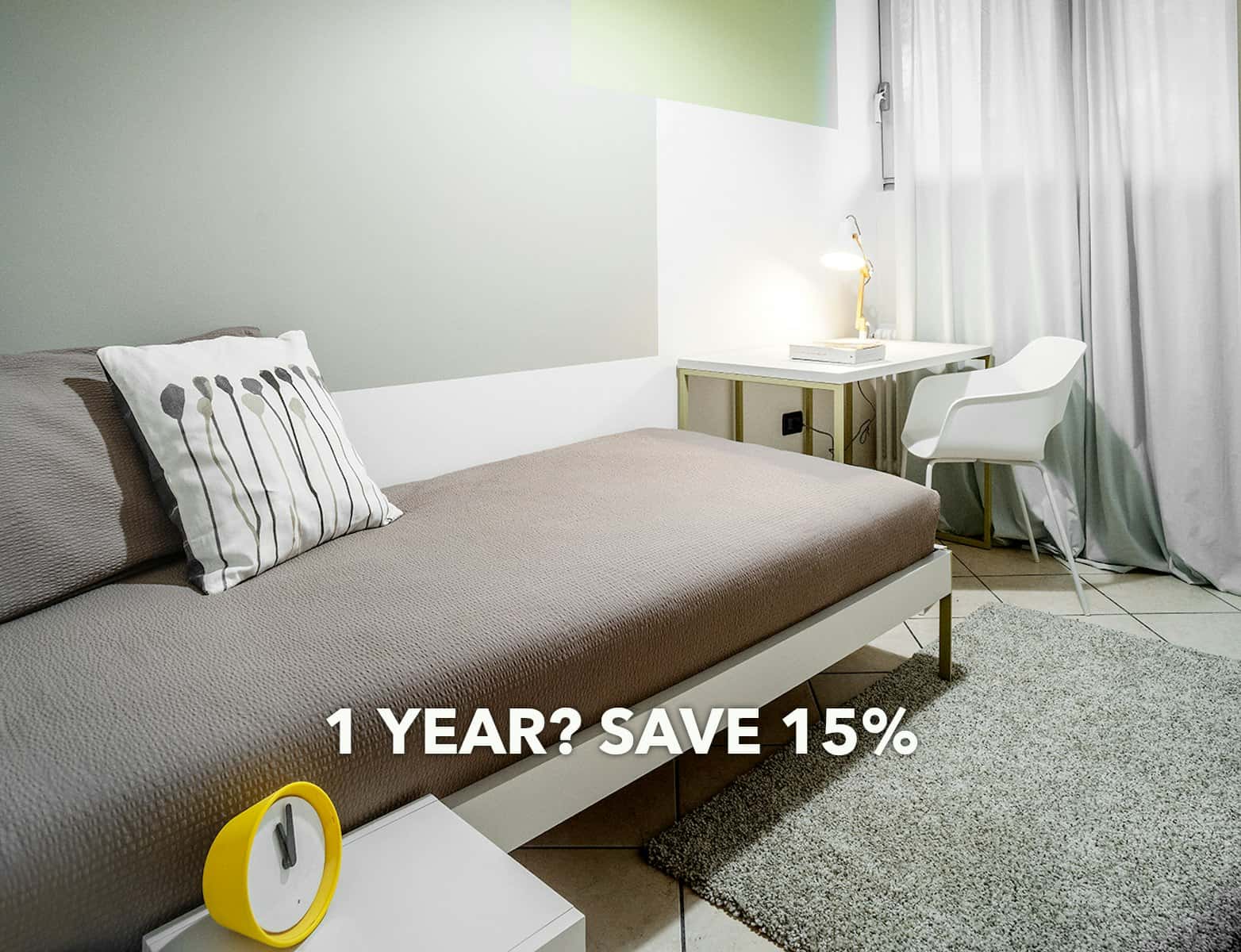 [ITA] Nella nostra azienda amiamo i soggiorni a lungo termine! Usufruite di sconti significativi se soggiornate con noi per 12 mesi. Se dovete soggiornare per meno di 12 mesi ma trovate qualcuno che vi sostituisca per il periodo rimanente, entrambi beneficerete dei nostri sconti sostanziali. Richiedete un preventivo oggi stesso e iniziate a risparmiare! Apartments - singole confortevoli e spazi comuni da vivere insieme! La camera più piccola di questo appartamento non ha nulla da invidiare alle altre, studiata per rendere la tua esperienza universitaria il più gradevole possibile si fa notare per le decorazioni geometriche che regalano volume e calore all'ambiente. L'arredamento - funzionale e di design - è caratterizzato da: un'illuminazione scelta appositamente per creare un'atmosfera accogliente e riposante; una sedia che ti eviti il mal di schiena nonostante le diverse ore di studio che dovrai affrontare; un materasso, di prima qualità, per garantirti un adeguato riposo ed un armadio a 3 ante con cassettiera per il tuo guardaroba, dal cappotto alla tutta da sci. 8 stanze progettate pensando specificamente alle esigenze di chi lo abita, con l'obiettivo di creare un ambiente funzionale, ideale per studiare o lavorare e al tempo stesso per socializzare. Il grande ambiente centrale favorisce il il co-living e il co-studying, occasione preziosa di scambio per frequentare l'università con profitto, mentre le camere singole offrono tutto lo spazio e la privacy necessarie per chi desidera stare da solo. La struttura dispone di:Cooking Area di 20 mq con piano cottura a induzione, forno, lavastoviglie e TV 50"Wifi 3 bagni - 3 lavatrici e 1 asciugatricePosto biciPosto auto [ENG] At our company, we love long-term stays! Enjoy significant discounts when you stay with us for 12 months. If you need to stay for less than 12 months but find someone to take over for the remaining period, both of you will benefit from our substantial discounts. Ask for a quote today and start saving! Apartments - comfortable single rooms and common spaces to live together!The smallest room in this apartment has nothing to envy to the others, designed to make your university experience as pleasant as possible and stands out for its geometric decorations that give volume and warmth to the environment. The furniture - functional and design - is characterized by: lighting chosen specifically to create a welcoming and relaxing atmosphere; a chair that avoids back pain despite the several hours of study you will have to face; a top quality mattress to guarantee you adequate rest a 3-door wardrobe with chest of drawers for your ski coat wardrobe. 8 rooms designed specifically with the needs of those who live there in mind, with the aim of creating a functional environment, ideal for studying or working and at the same time for socializing. The large central area encourages co-living and co-studying, a precious opportunity for exchange to attend university profitably, while the single rooms offer all the space and privacy necessary for those who wish to be alone. The structure has: Cooking Area of 20 m2 with induction hob, oven, dishwasher and 50" TV Wifi 3 bathrooms - 3 washing machines and 1 dryer Bike parking Parking space