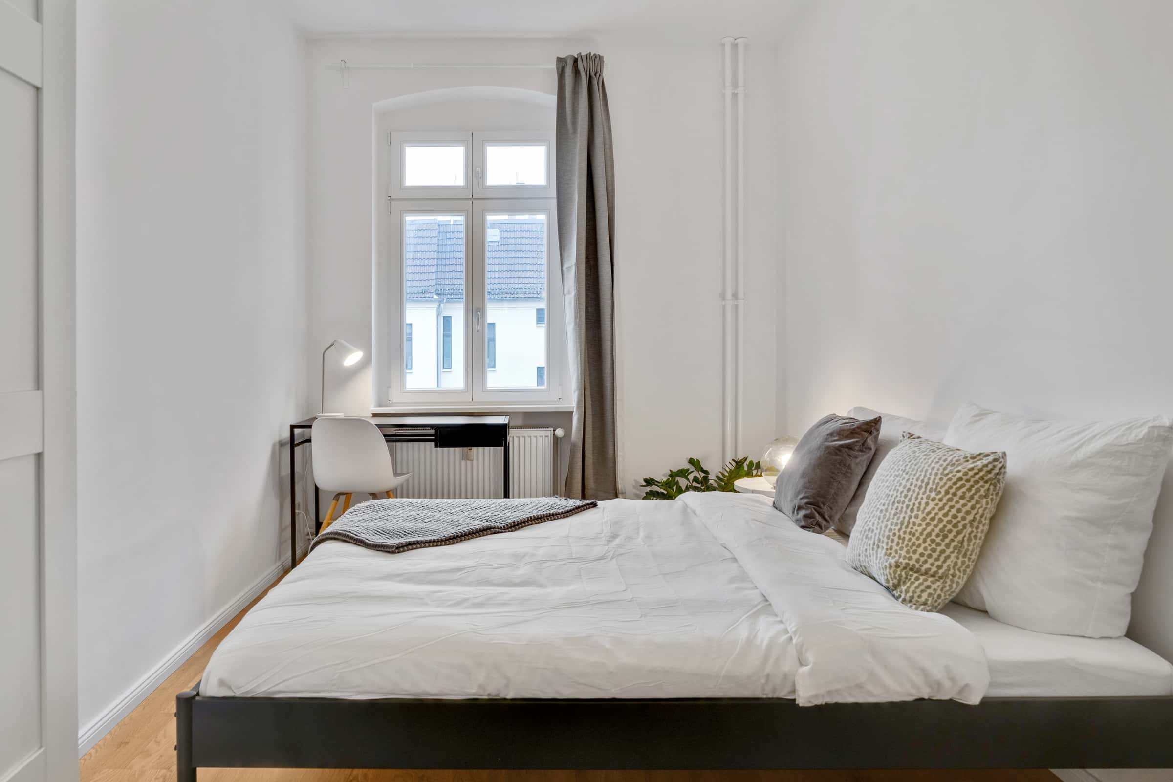[EN] Cozy room in Friedrichshain in a newly renovated apartment. The room has all that you need to live, work and study here. From appliances to linen and towels, internet and more. The apartment is designed in a modern style with spacious rooms and a great kitchen. All costs are included in the rent, including bills, internet, bi-weekly cleaning and more! Only 5 minutes walk from the S-/U-Bahn station Frankfurter Tor (U5, M10) and 10 minutes from Storkower Straße (S41, S42, S8, S85) making it easy to get to any other vibrant area in Berlin within 30 minutes. This apartment provides everything you need for comfortable daily living. Your room comes fully furnished, complete with a bed and workspace, and the entire apartment is equally well-equipped. The kitchen includes appliances, cookware, a fridge, and a stove. Additionally, you’ll have access to a washing machine and Wi-Fi. We’re sure you’re curious about your future flatmates! Typically, they are international students or young professionals aged 20 to 35 who enjoy the experience of shared living. While we can’t share further details due to privacy regulations, we’re confident you’ll find a great community here. Please note that each room is for single occupancy, with guests allowed for a maximum of five days per month. To book the apartment, we require a few documents: a copy of your ID and proof of income (we accept flexible options such as an employment or internship contract, blocked account, savings, recent payslips, or similar documents from a guarantor). When booking, you’ll pay the first month’s rent in advance, but rest assured, you’ll only be charged for rent starting from your move-in date.