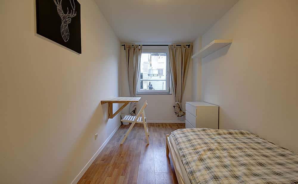 [EN] Our flats fulfil all your daily living requirements. Every flat comes readily equipped with a kitchen, including refrigerator, cooking equipment and dishes. Flats also include a washing machine and Wi-Fi Internet. Each room is fully furnished and offers a comfortable bed with fresh linen and a workspace. The area provides you with several shopping opportunities and excellent connections to public transport. This apartment provides everything you need for comfortable daily living. Your room comes fully furnished, complete with a bed and workspace, and the entire apartment is equally well-equipped. The kitchen includes appliances, cookware, a fridge, and a stove. Additionally, you’ll have access to a washing machine and Wi-Fi. We’re sure you’re curious about your future flatmates! Typically, they are international students or young professionals aged 20 to 35 who enjoy the experience of shared living. While we can’t share further details due to privacy regulations, we’re confident you’ll find a great community here. Please note that each room is for single occupancy, with guests allowed for a maximum of five days per month. To book the apartment, we require a few documents: a copy of your ID and proof of income (we accept flexible options such as an employment or internship contract, blocked account, savings, recent payslips, or similar documents from a guarantor). When booking, you’ll pay the first month’s rent in advance, but rest assured, you’ll only be charged for rent starting from your move-in date.